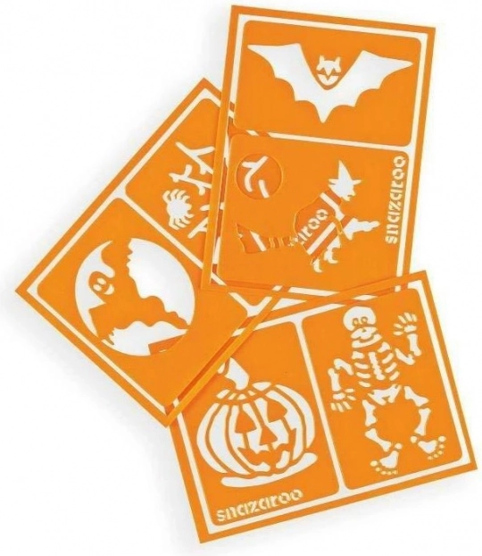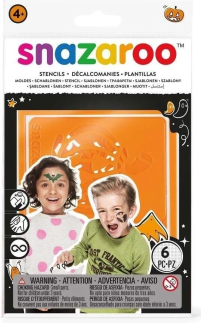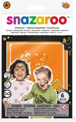 Sada šiestich šablón SNAZAROO na jednoduché a rýchle maľovanie na tvár aj telo. Tématické motívy na Halloween, samolepiaci podklad pre stabilitu, pružný materiál pre priľnutie ku krivkám a opätovné použitie vďaka umývateľnému prevedeniu.
