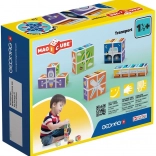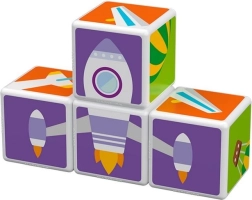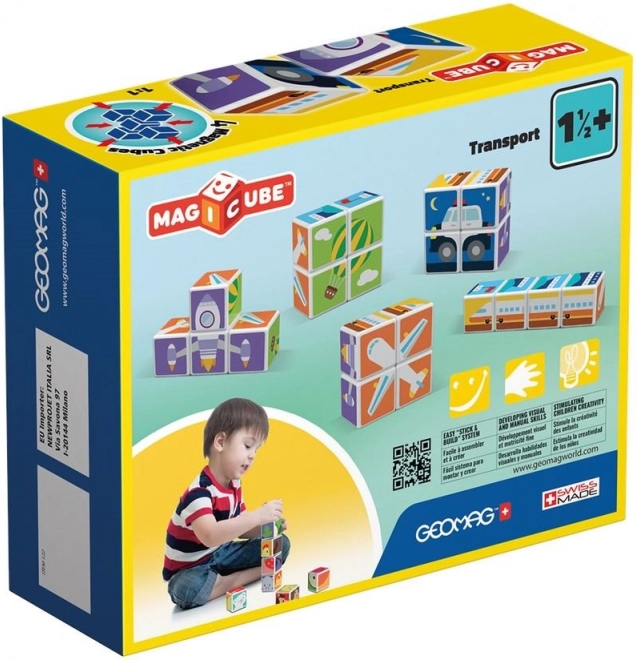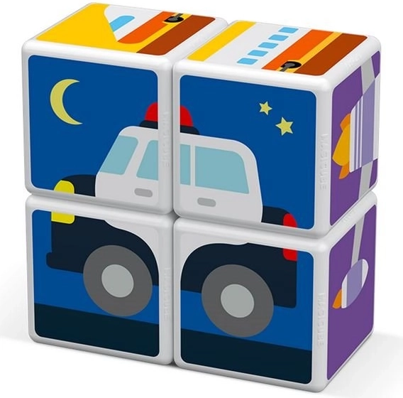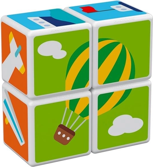 GEOMAG Magicube Printed Transport je šikovná magnetická stavebnica, ktorá spája hranie a učenie. Štyri potlačené kocky s motívmi dopravy a tri obojstranné karty pozývajú deti k skladaniu áut, lietadiel, rakiet aj ďalších obrázkov. Vďaka magnetom, ktoré fungujú na každej hrane, je stavanie intuitívne a bezpečné.
