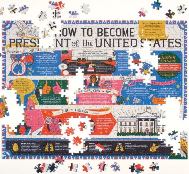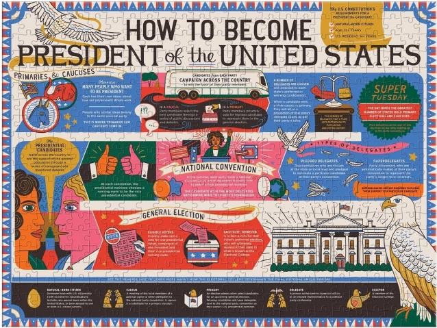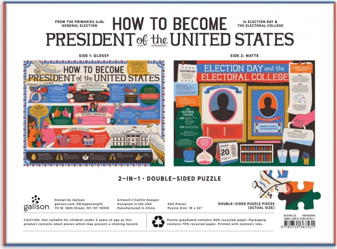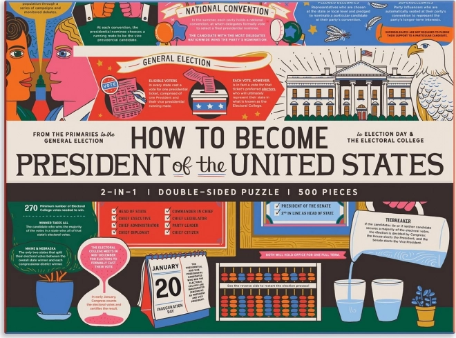 Objavte zábavnú a zároveň poučnú skladačku: obojstranné puzzle s témou cesty do prezidentského úradu USA. Užite si 500 dielikov, dve odlišné strany (lesklú a matnú) pre ľahšie skladanie a prehľadný motív s krokmi od primárok až po voľby. Súčasťou je aj ilustračný obraz oboch motívov.
