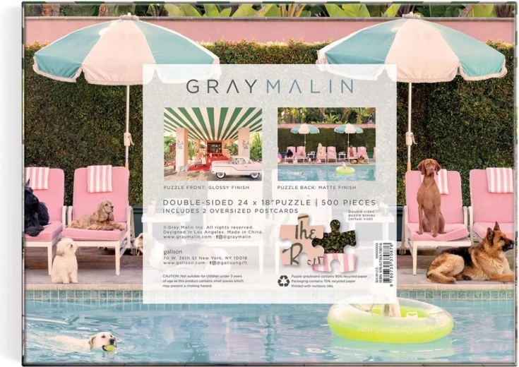 Štýlové obojstranné puzzle s motívmi série Psy v hoteli Beverly Hills od fotografa GRAY MALIN prináša 500 precízne vyrezaných dielikov a dva ikonické obrázky v jednom balení. Vyrobené z recyklovaného papiera, s matnou povrchovou úpravou pre verné farby a detaily, balené v pevnej FSC krabičke – ideálny darček pre milovníkov zvierat, umenia aj puzzle.