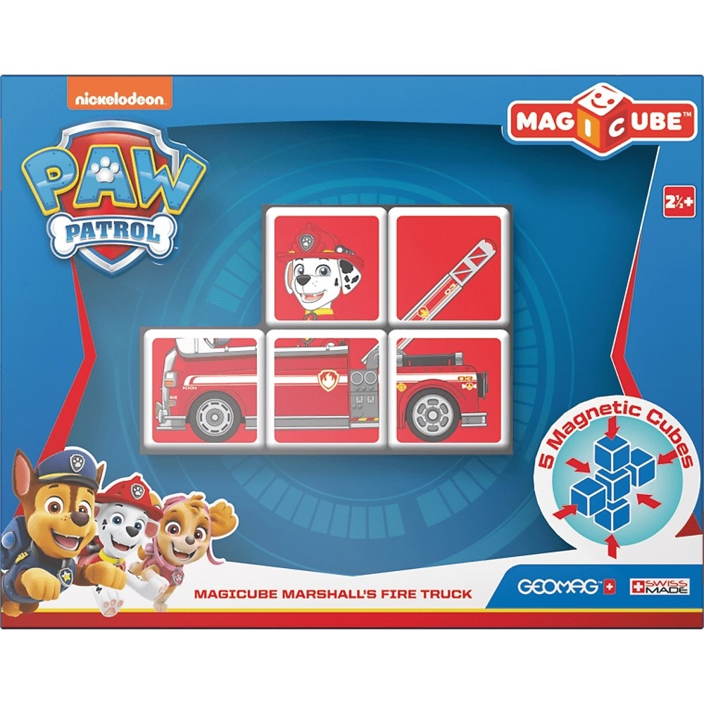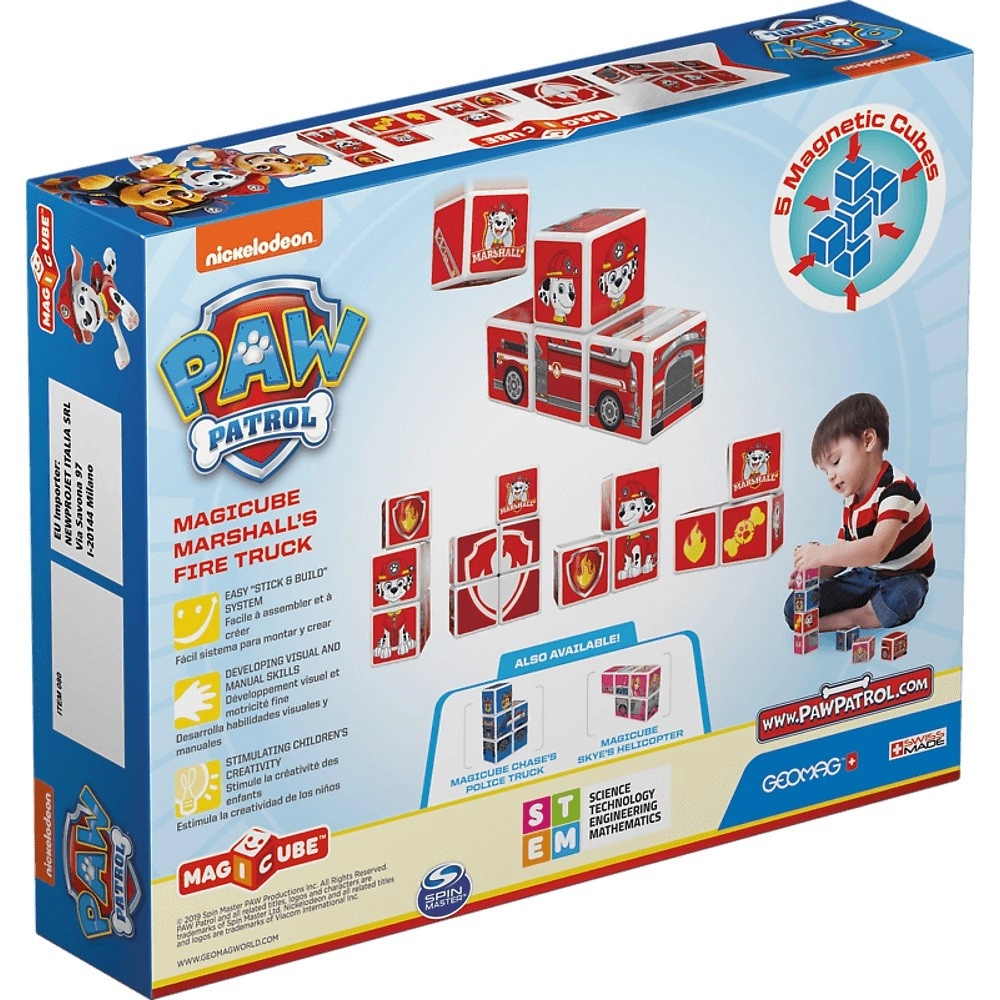 Sada magnetických kociek Geomag Magicube s motívom MARSHALLA z Tlapkovej patroly prináša deťom intuitívnu stavebnú zábavu. Každá kocka sa vďaka magnetom prichytí z akejkoľvek strany, takže stavanie je jednoduché, stabilné a zábavné. Jasné farby a motívy ako Marshall, hasičské auto, plamenný štít či kocka s labkou pozývajú k skladaniu obrázkov aj tvorbe 3D modelov.