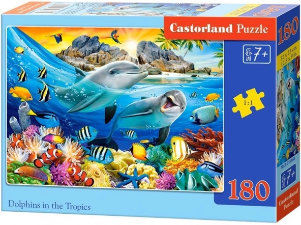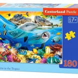 Po zložení vznikne detailný obrázok s tropickými delfínmi, ktorý sa skvele hodí na vystavenie v detskej izbe. Puzzle sú vyrobené z kvalitného materiálu s presnými výsekmi, vďaka ktorým dieliky dobre držia pohromade.