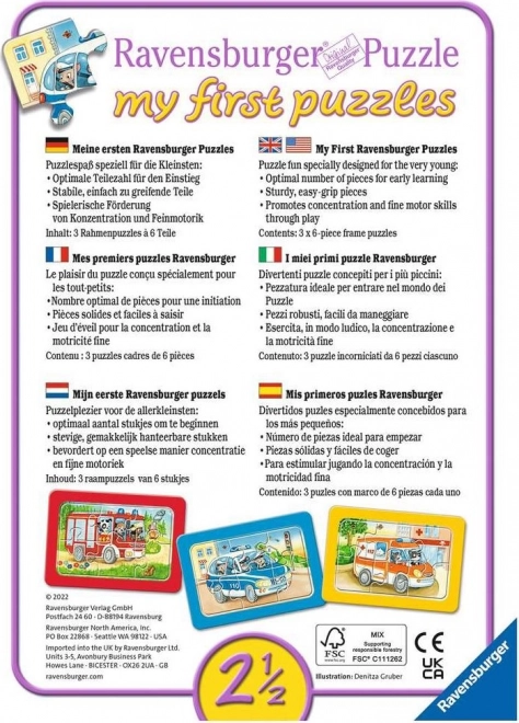 Objavte radosť z prvých skladačiek s týmito detskými puzzle RAVENSBURGER. Sada obsahuje tri obrázky po šiestich dielikoch, vyrobené z extra silného kartónu pre malé detské ruky. Podporujú jemnú motoriku, sústredenie a fantáziu a zaujmú roztomilými zásahovými vozidlami so zvieratkami za volantom.