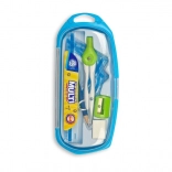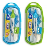 - Obsah sady: kovové kružidlo, pravítko 15 cm, 2× trojuholník, uholník, ceruzka, strúhadlo, guma