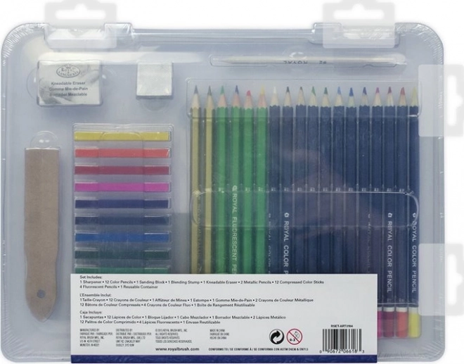Univerzálna 35-dielna kresliaca sada v praktickom plastovom boxe od značky ROYAL & LANGNICKEL pre začiatočníkov aj pokročilých. Obsahuje akvarelové pastelky, farebné uhlíky, fluorescenčné a metalické ceruzky a tiež nevyhnutné príslušenstvo na pohodlné kreslenie doma aj na cestách.
