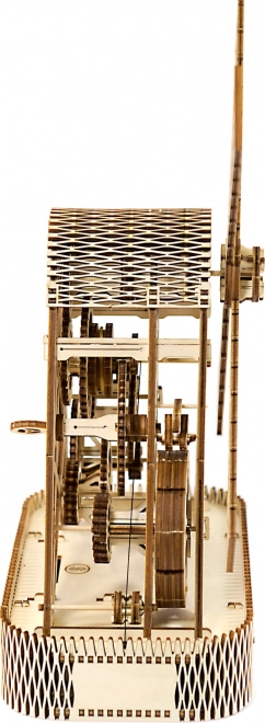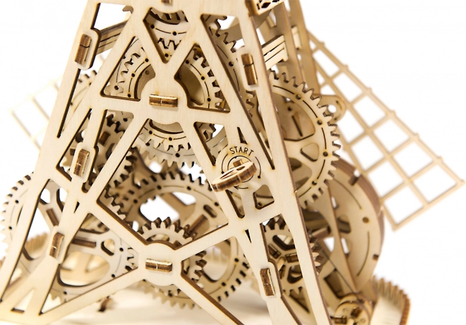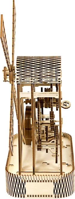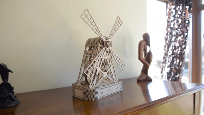 Po natiahnutí sa lopatky mlyna otáčajú pomocou gumičkových prevodov, čo zabezpečuje realistický pohyb.