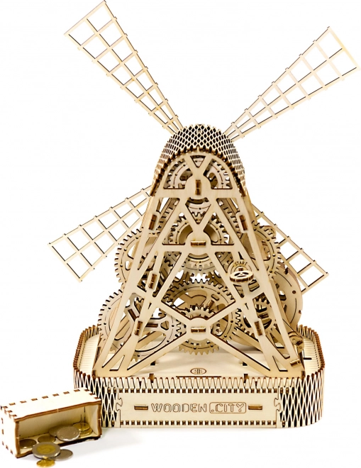 Po natiahnutí gumovým pohonom sa lopatky mlyna začnú otáčať, a vďaka zotrvačníku medzi ozubenými kolesami si užijete zábavu až na jednu minútu na jedno natiahnutie. Integrovaná schránka v stojane ponúka praktické využitie ako pokladnička alebo úložný priestor pre drobnosti.