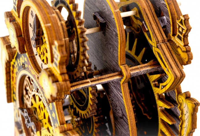 Model je vyrobený z ekologickej brezovej preglejky a skladá sa bez lepidla či náradia. Pri skladaní spoznáte princípy prevodov, gumičkových motorov a chodu hodinového mechanizmu z bezprostrednej blízkosti.