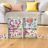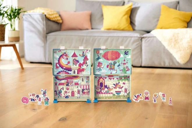 Súčasťou balenia sú tiež upevňovacie sponky a herné figúrky, ktoré deťom umožnia scénu oživiť. Puzzle sa skladá priamo do škatuľky, ktorá slúži ako pozadie divadielka – praktické, zábavné a ideálne na cesty.