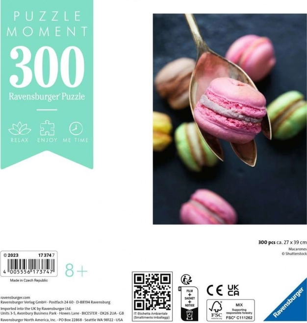 Užite si relax pri kvalitnom skladaní s puzzle Ravensburger z edície Puzzle Moment. Motív farebných makróniek a 300 dielikov je ideálny na krátke oddychové chvíľky, precízne spracovanie a dokonalé lícovanie dielikov zaistia skvelý zážitok.