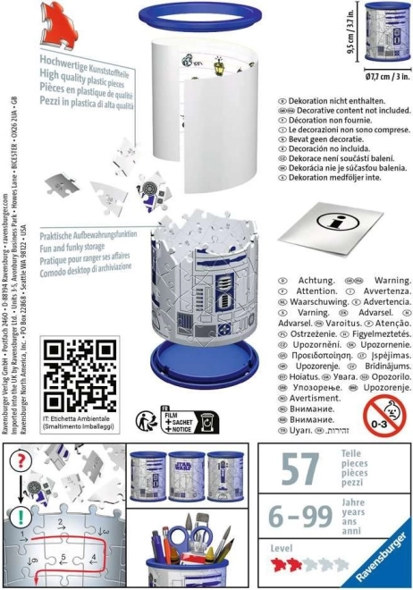 Prestaňte hľadať perá po celom stole! Tento RAVENSBURGER 3D puzzle stojan Star Wars predstavuje praktickú a zároveň zábavnú formu organizácie. Skladať ho možno podľa motívu pre náročnejších alebo podľa číslovania na zadnej strane dielikov. Vďaka špeciálnym zakriveným dielikom z kvalitného plastu prináša tento stojan nielen krásny dizajn, ale aj pevnú stabilitu bez potreby lepenia.