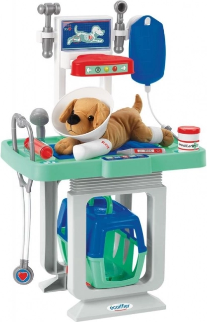 - Kompletný set na hru na veterinára – stôl, box, plyšový psík a nástroje.