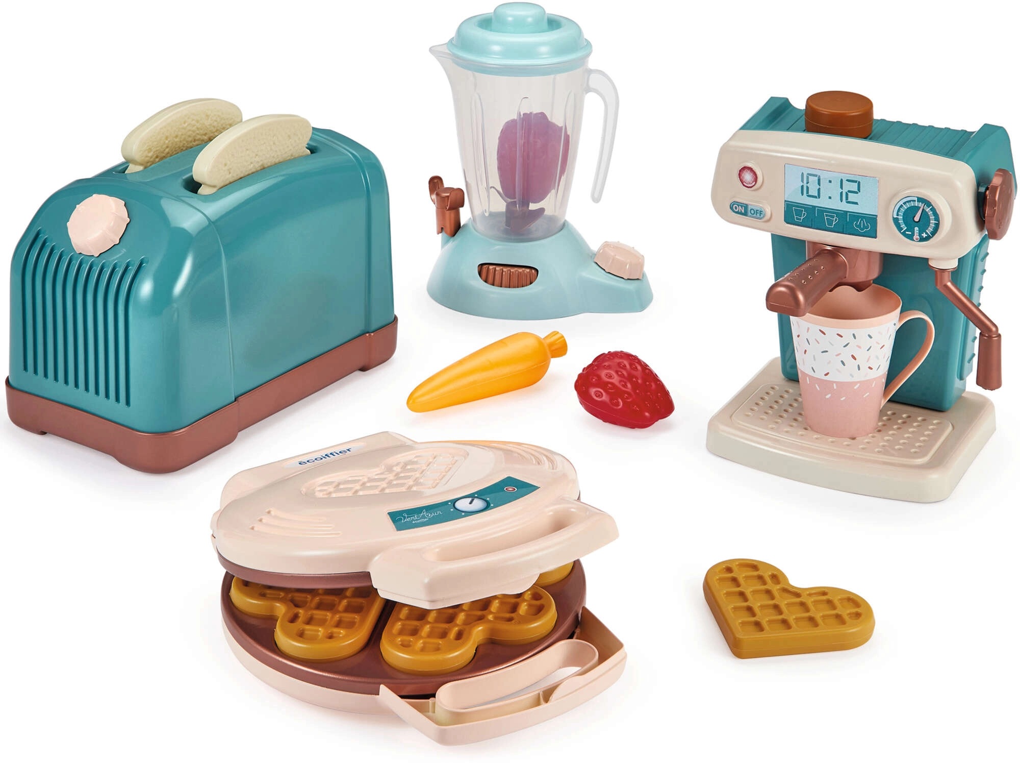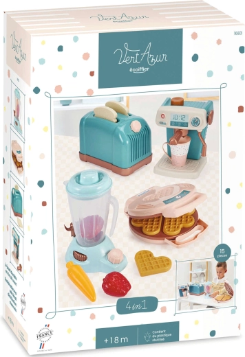 Objavte kreatívny svet varenia s detskou kuchynskou sadou ECOIFFIER Vert Azur – toastovač, kávovar, vaflovač a mixér doplnené o 15 dielov príslušenstva. Sada podporuje fantáziu, jemnú motoriku a rolovú hru, má pohyblivé prvky a je vyrobená z kvalitného plastu v modernom modro‑hnedom farebnom prevedení.