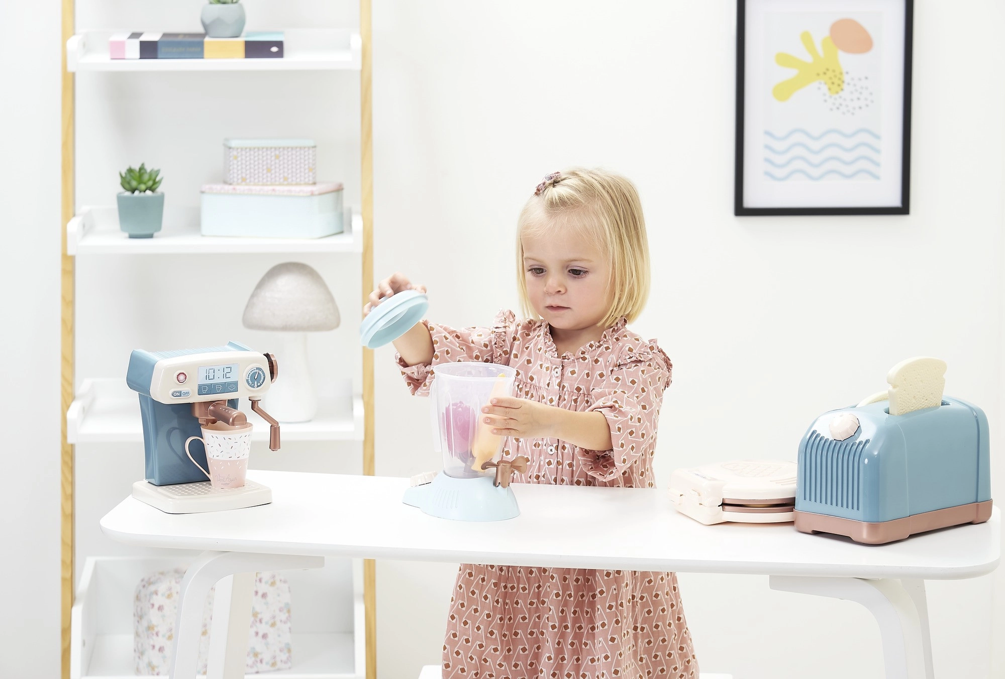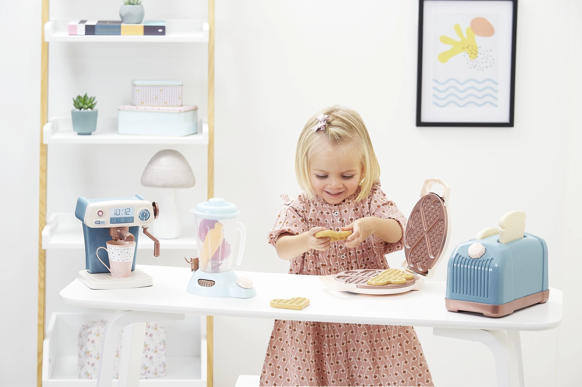 Táto štýlová sada pre malých kuchárov prináša všetko, čo deti potrebujú na napodobňovanie dospelých v kuchyni. Toastovač s „hriankami“, realistický kávovar, roztomilý vaflovač a priehľadný mixér pozývajú k hravému „vareniu“, servírovaniu aj spoločnému stolovaniu. Podporuje sústredenie, logické myslenie a koordináciu oko‑ruka.
