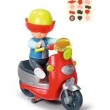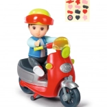 Červený skúter s hravými detailmi dopĺňajú žltá prilba a aršík nálepiek, vďaka ktorým si deti môžu výbavu ozdobiť presne podľa svojej fantázie.