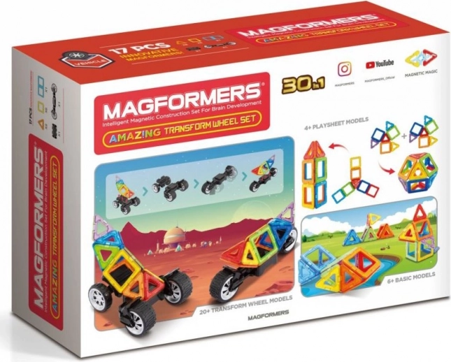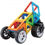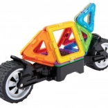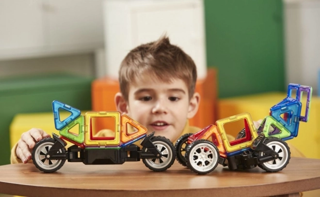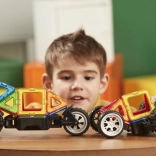 Jeden zo špeciálnych podvozkov je vybavený masívnymi kolesami, ktoré možno nezávisle od seba otáčať až o 90°, takže ich využijete na modelovanie jednostopových aj dvojstopových vozidiel. Druhý podvozok je už klasická náprava s 2 prepojenými kolesami, pri ktorej je zasa možnosť nastaviť 3 rôzne výškové polohy prepojovacej dosky, čo príde vhod pre rôzne odvážne karosérie štvorkoliek a bugín. V kombinácii s akýmikoľvek ďalšími dielmi Magformers pestrosť aj veľkosť vozidiel násobne rastie. Väčšina zo stoviek postavených áut a motoriek z tejto stavebnice je aj prekvapivo odolná a možno ich teda smelo využívať aj ako funkčnú hračku. Vhodné pre deti od 3 rokov.