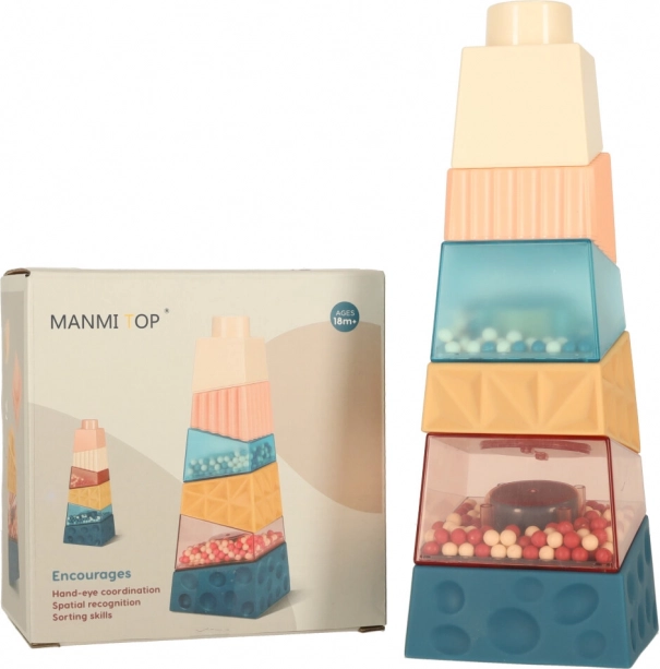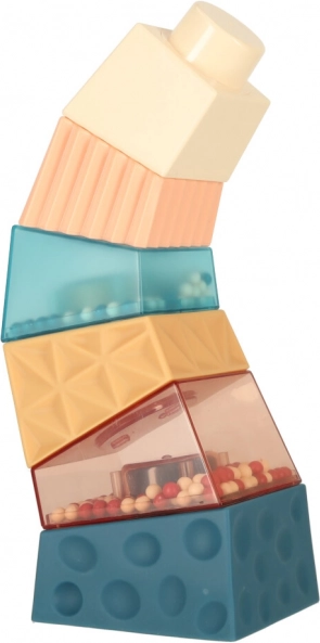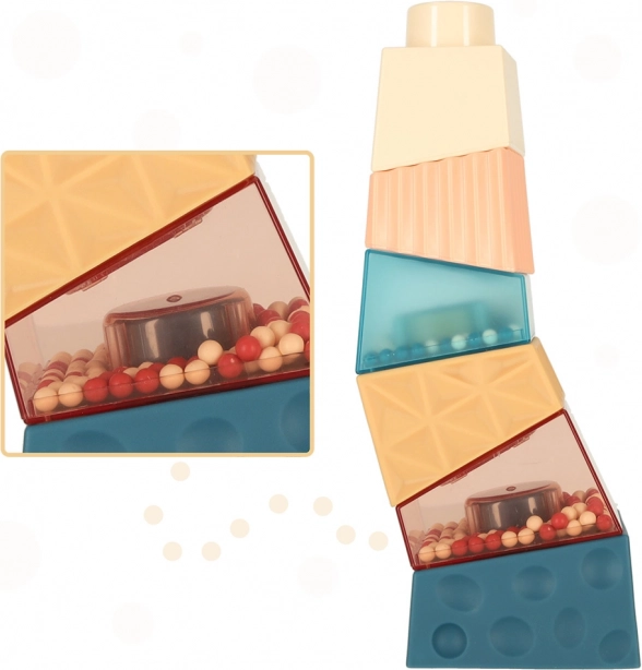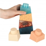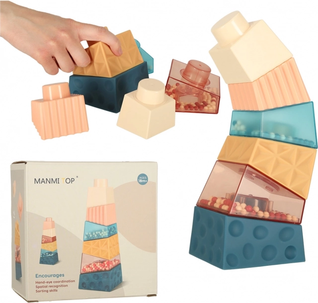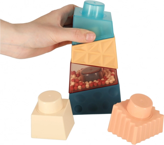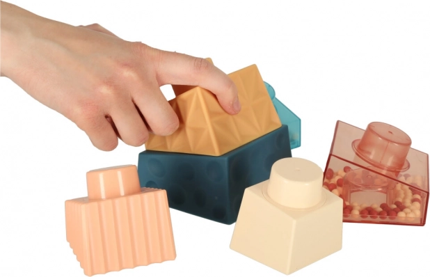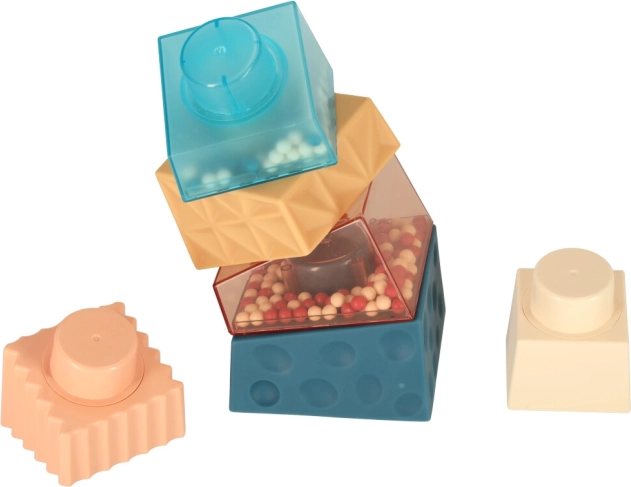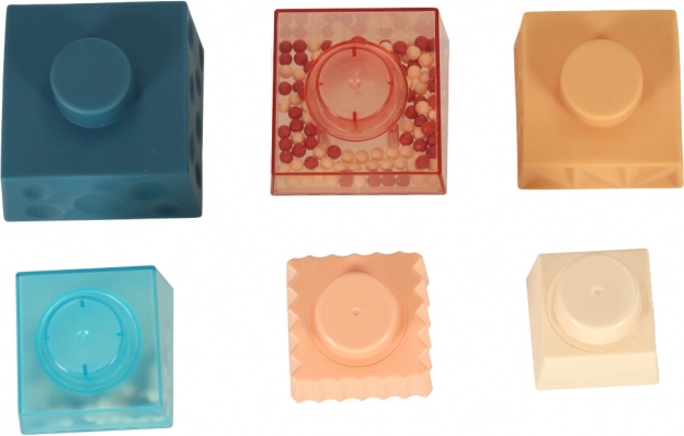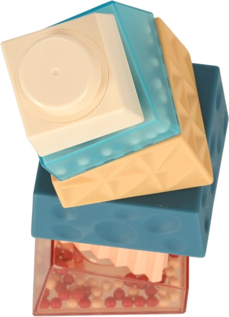 Farebné a textúrované kocky, vrátane tých s guľôčkami, stimulujú zrak a hmat dieťaťa.