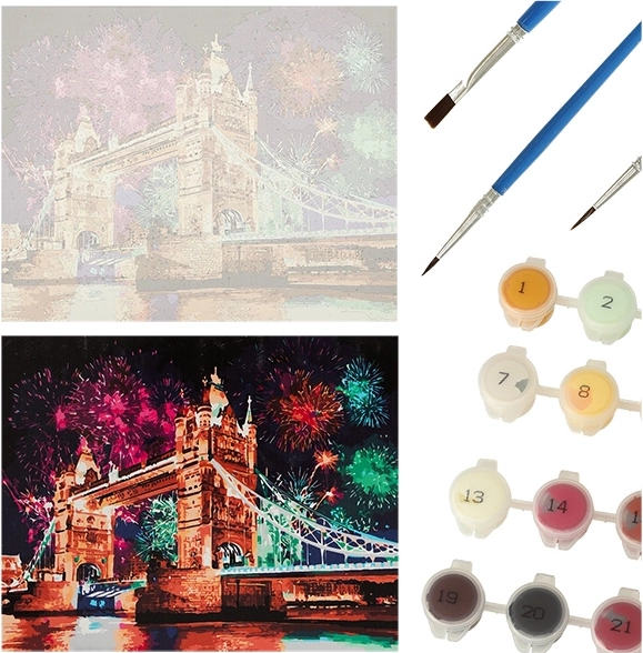 Súprava obsahuje plátno, štetce a farebné nádoby – všetko, čo potrebujete na vytvorenie nádherného obrazu.