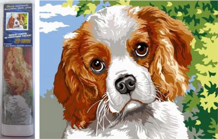 Balenie obsahuje: plátno s predtlačeným obrázkom, pero na aplikáciu kamienkov, misku na vysypanie kamienkov, vosk na nalepenie, sadu farebných kamienkov.