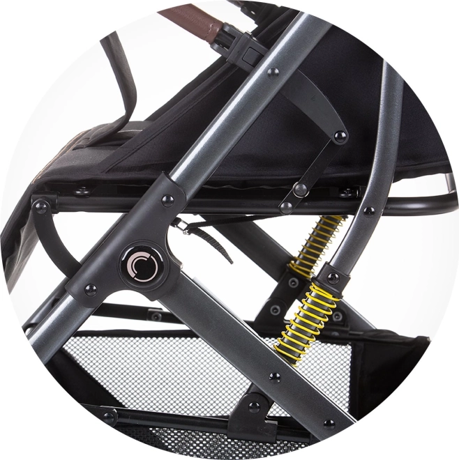 - Bezpečnosť: 5-bodové pásy, článková brzda na zadných kolesách, bezpečnostný popruh na rukoväti