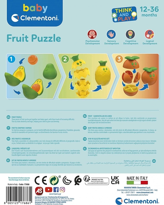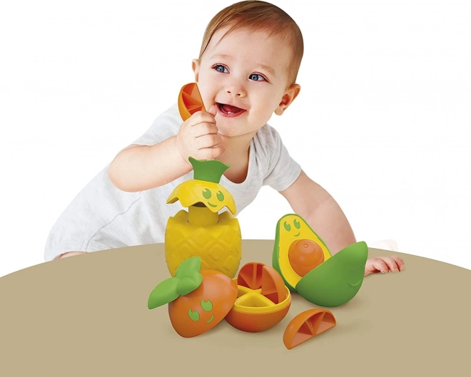 Objavte šikovné a udržateľné hranie s CLEMENTONI BABY. Sada Skladacie ovocie prináša tri roztomilé plody – avokádo, ananás a pomaranč – ktoré deti motivujú k objavovaniu, triedeniu a skladaniu. Každý prvok je navrhnutý tak, aby podporoval rozvoj logického myslenia, zrakovo-motorickej koordinácie a hmatového vnímania.