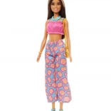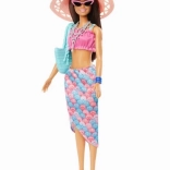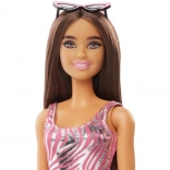 Bábika Barbie má jednoduché hnedé vlasy a je oblečená v ružovom plavkovom kostýme s motívom zebry.