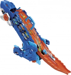 Na chrbte T-Rexa je pripravená dvojprúdová pretekárska trať pre napínavé súboje. Víťaz pokračuje v jazde, zatiaľ čo porazený je „vypudený“ dinosaurom – ideálne pre súťaživú hru. Autíčka možno navyše vystreľovať priamo z tlamy pre extra akciu. V balení nájdeš 2 autíčka HOT WHEELS 1:64, takže zábava začína hneď.