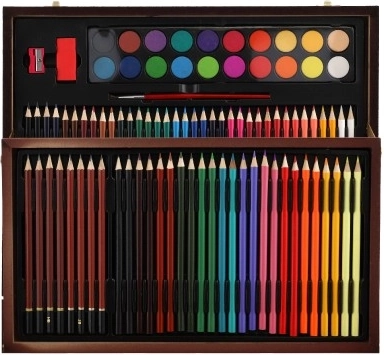 Kreatívna umelecká sada je perfektným riešením pre všetkých, ktorí milujú tvoriť. Vďaka praktickému drevenému puzdru sú všetky pomôcky prehľadne usporiadané a vždy pripravené na použitie.