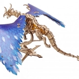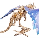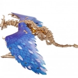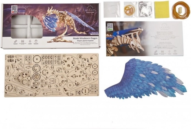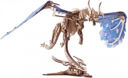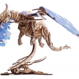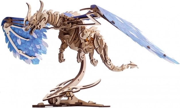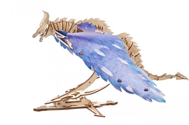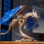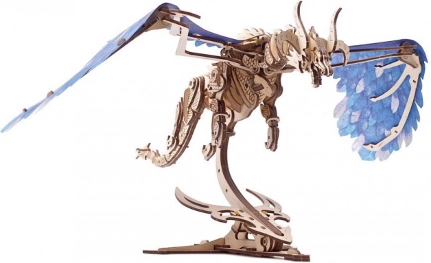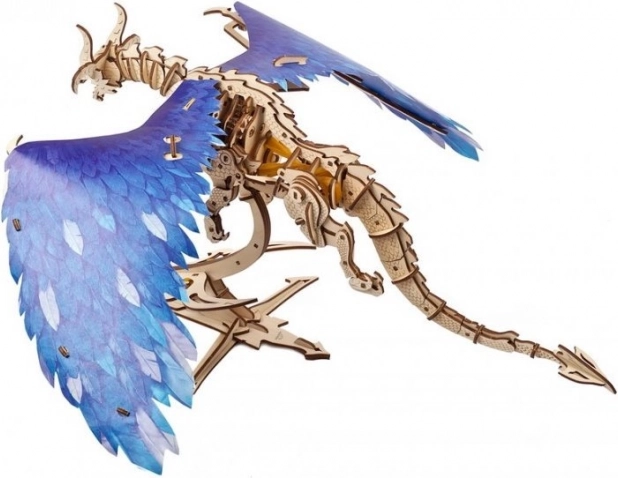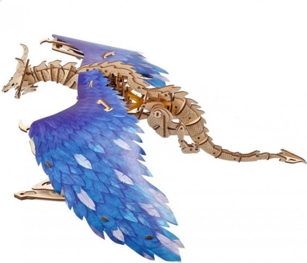 Laserom vyrezané dieliky z preglejky do seba presne zapadajú a vytvárajú realistický model draka s výraznými modrými krídlami, pripravený zažiariť na stojane aj v akcii.