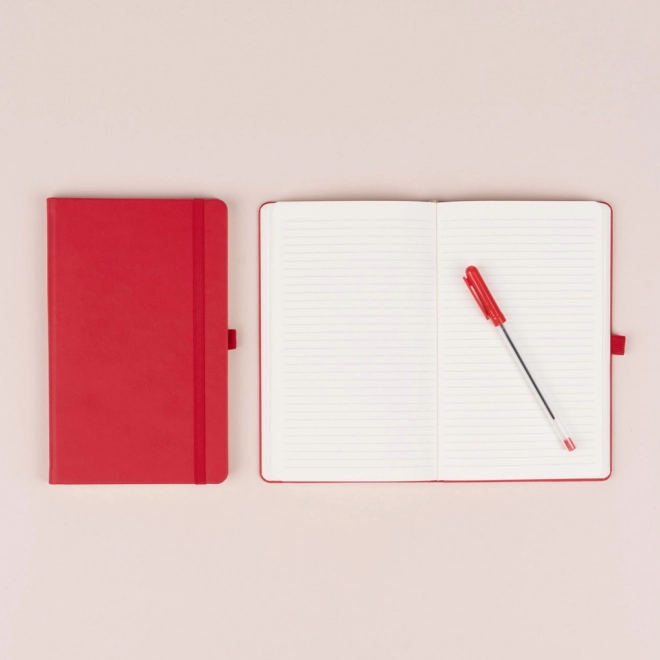 Elegantný linajkovaný zápisník v klasickej červenej farbe ponúka pevnú knižnú väzbu, elastickú gumičku, pútko na pero a textilnú záložku. Povrch s hrubšou štruktúrou je ideálny na razbu loga, riadky 6 mm na kvalitnom žltom papieri zaistia pohodlné písanie doma, v kancelárii aj na cestách.