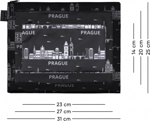 Každá taštička má praktické horné zapínanie na zips a kontrastnú potlač s panorámou PRAHY. Vďaka čiernej farbe a nadčasovému dizajnu ich ľahko zladíte s akoukoľvek batožinou. Súprava je skvelá aj ako štýlový suvenír alebo darček pre milovníkov mesta.