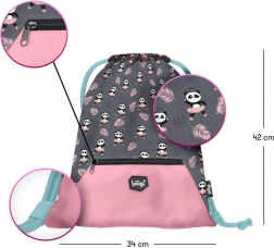 Štýlové školské vrecko s motívom Panda je ideálne na telocvik alebo prezuvky. Je vyrobené z pevného umývateľného materiálu, má praktické predné vrecko na zips a pevné šnúrky pre jednoduché nosenie na chrbte.