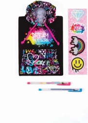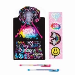 Blok s kapucňou v štýle graffiti je perfektný pre dievčatá od 6 rokov, ktoré chcú vyjadriť svoju kreativitu. Tento moderný blok je ideálnym miestom na zapisovanie zážitkov, tajných snov alebo plánov na dobrodružstvá. Dodáva sa s dvoma perami, nálepkami a lepiacimi nášivkami, ktoré vám umožnia personalizovať každý zápisník.