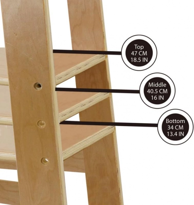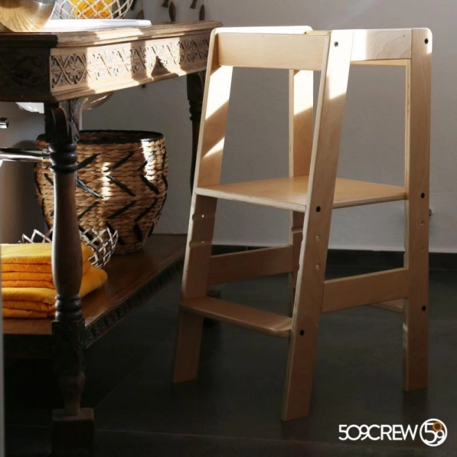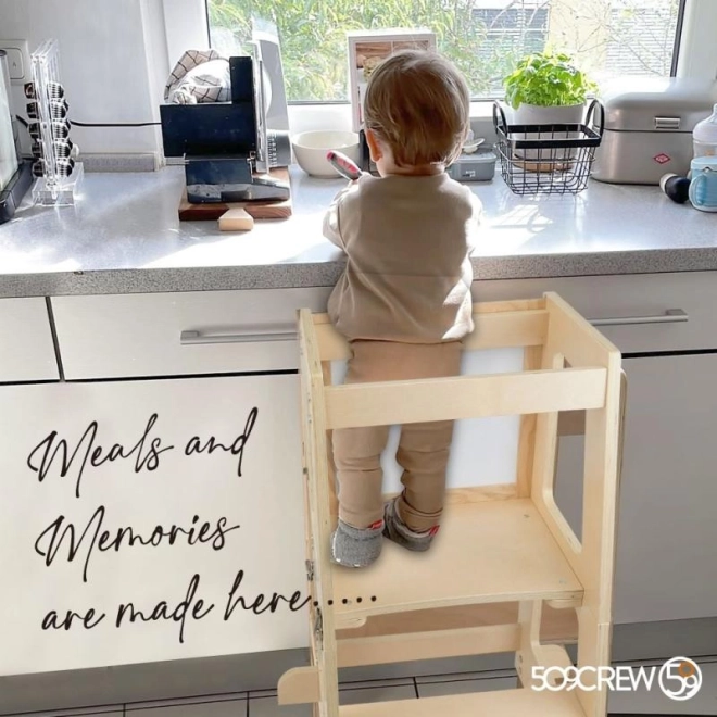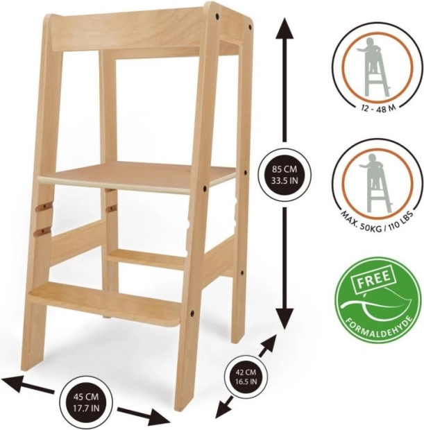 Objavte čaro učenia s Učiacou vežou prírodnou, ktorá sa ľahko prispôsobí vašim potrebám a výške dieťaťa vďaka trom úrovniam nastavenia plošiny. To umožňuje deťom bezpečný prístup k väčšine kuchynských liniek a kúpeľňových umývadiel.