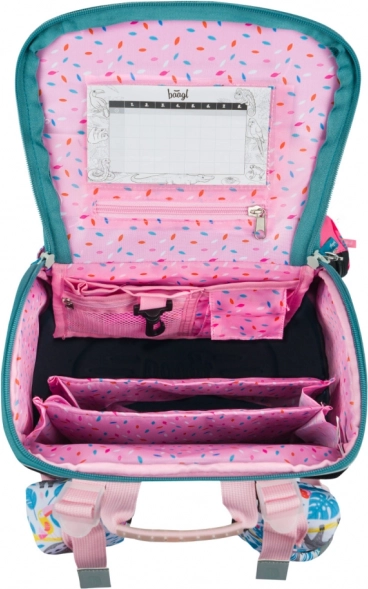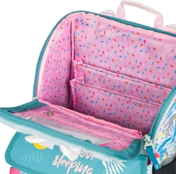 • Vo vnútri aktovky je priehľadné vrecko s rozvrhom a vnútorný organizér umožňujúci rovnomerné rozloženie hmotnosti, doplnený gumičkou na fixáciu.