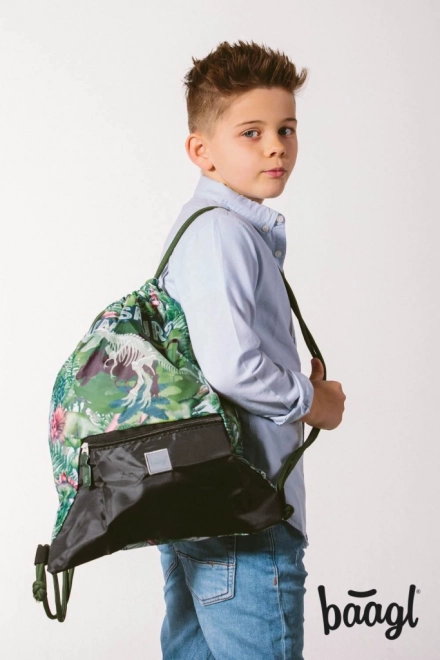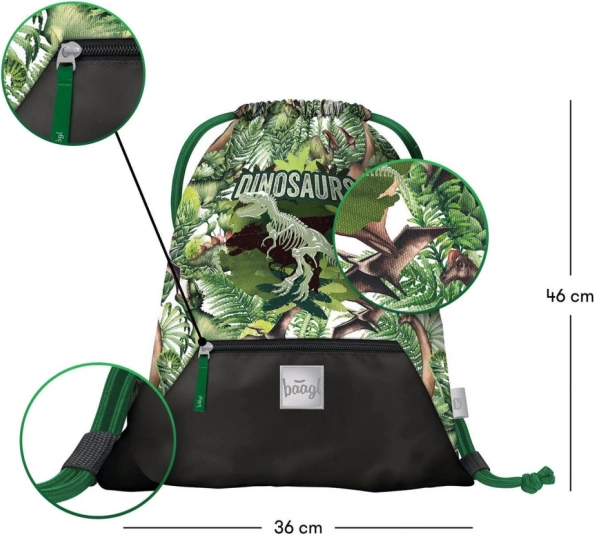 Vak na prezúvky BAAGL Dinosaury vyniká nielen svojím výrazným dizajnom, ale aj praktickými funkčnými prvkami. Vyrobený z pevného a umývateľného materiálu, ktorý zabezpečuje dlhú životnosť. V dolnej časti nájdete vrecko na zips, ideálne pre drobné predmety. Zatváranie pomocou pevných tkaníc umožňuje pohodlné nosenie na chrbte.