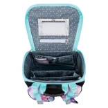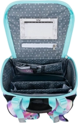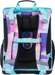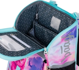 Aktovka sa pýši novým vyklápacím systémom otvárania, čo zjednodušuje prístup k pomôckam priamo z lavice. Vo vnútri nájdete priehľadné vrecko s rozvrhom, vnútorný organizér s gumkou a bočné vrecká z pevnej sieťoviny vhodné pre fľašu na pitie.