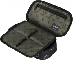 Vnútorné vrecká a elastické pásky umožňujú jednoduché usporiadanie písacích potrieb, pričom zelená podšívka s motívom okrídlených tvorov pridáva unikátne kúzlo.