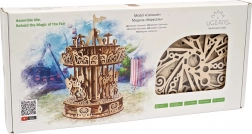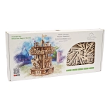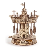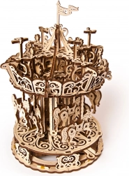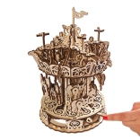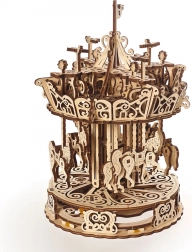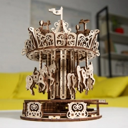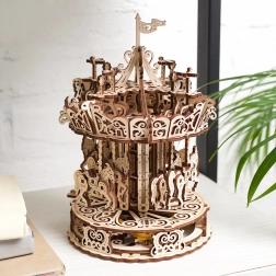 Urobte si radosť elegantným kolotočom z kvalitnej preglejky, ktorý spája nostalgiu s chytrou mechanikou. Vďaka gumovému natahovaciemu pohonu sa stredový stĺp a strieška točia opačným smerom, čím vytvárajú optickú ilúziu vysokej rýchlosti. Koníky plynule stúpajú a klesajú a nad kolotočom krúžia drobné vtáčiky – to všetko je krásne vidieť vďaka otvorenému dizajnu.