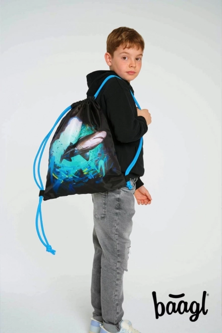 Praktické vrecko Baagl eARTh – Žralok by Lukero je ideálne na prezuvky, obuv aj drobnosti na voľný čas. Ponúka pevný umývateľný materiál, spoľahlivé sťahovanie a pohodlné nosenie na chrbte vďaka pevným šnúrkam.