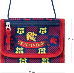 Peračník s dvoma chlopňami, vrecko na prezuvky s predným vreckom na zips, dosky na zošity a peňaženka na krk – všetko vo farbách a so znakom Gryffindoru.