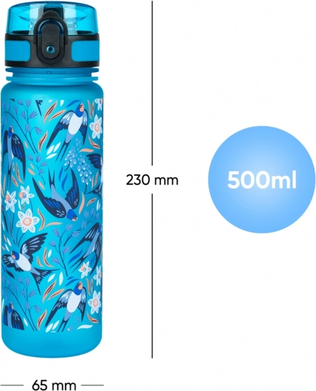 Štýlová tritánová fľaša na pitie BAAGL s motívom lastovičiek s objemom 500 ml je ideálna do školy, na výlety aj šport. Ponúka uzamykateľné viečko proti rozliatiu, pútko na ľahké nosenie a vložené sitko na ovocie či čaj. Je vyrobená z bezpečného tritánu bez BPA, bez zápachu a vhodná aj na horúce nápoje.