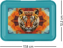 Tyrkysový plastový box s farebnou grafikou tigra na veku dodáva štýl každému obedu.