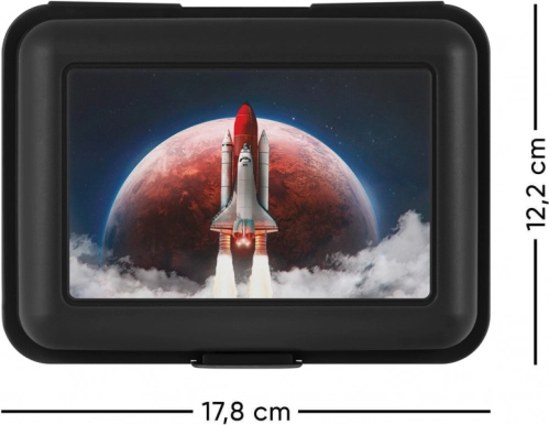 Tento plastový box na desiatu má kryt s vesmírnou tematikou, zobrazujúci štart raketoplánu s planétou v pozadí.