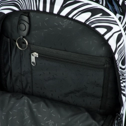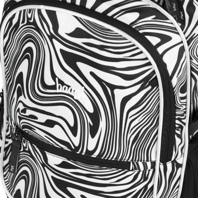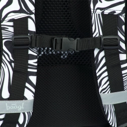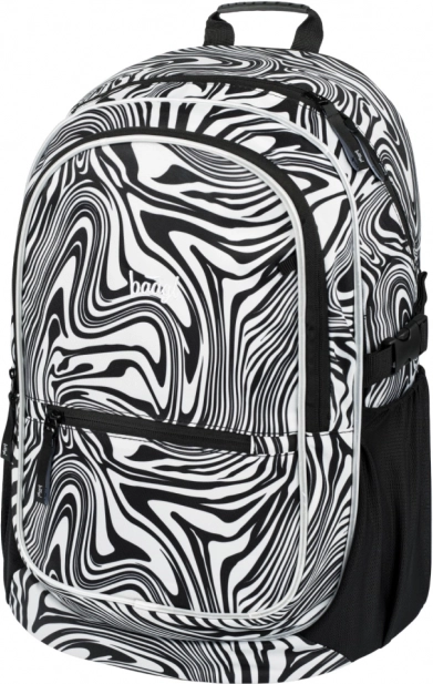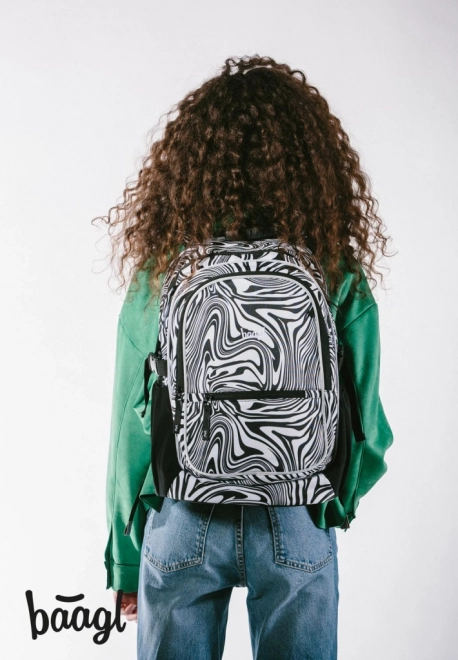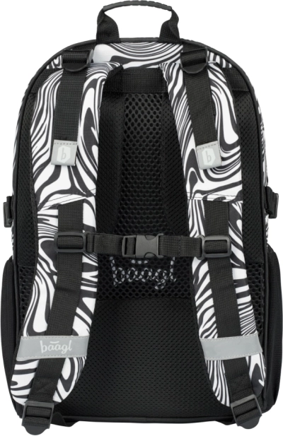 - Dizajn a funkčnosť: moderný čiernobiely swirl vzor, prívesok BAAGL, premyslené vrecká a zipsy pre rýchlu organizáciu.