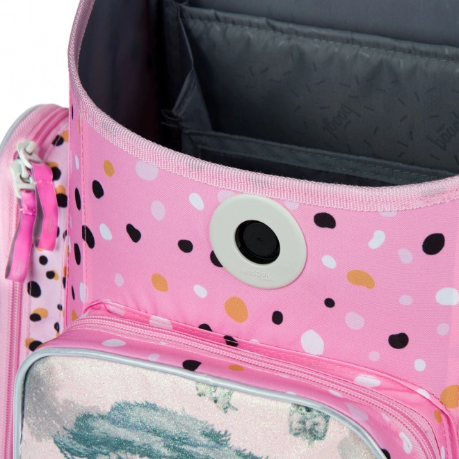 Vo vnútri nájdete prehľadný organizér na rovnomerné rozloženie hmotnosti a priehľadné vrecko s rozvrhom. Nechýba izolované predné vrecko na desiatu a dve bočné vrecká ideálne na fľašu s pitím. Ľahká vystužená konštrukcia s pevným dnom drží tvar, odolný vodeodolný materiál chráni obsah pred počasím a reflexné prvky zvyšujú viditeľnosť dieťaťa. Súčasťou je aj štýlový plyšový prívesok.