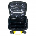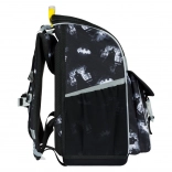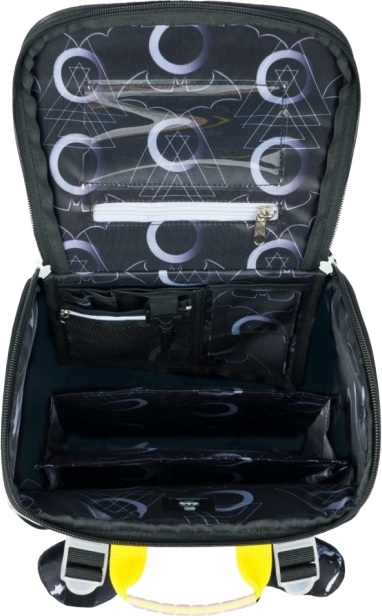 Praktické vyklápacie otváranie sprístupní obsah aktovky priamo z lavice. Vo vnútri nájdete priesvitné vrecko na rozvrh a organizér s fixačnou gumičkou pre prehľadné uloženie učebníc a zošitov. Izolované predné vrecko s prackou ochráni desiatu, bočné sieťované vrecká pojmú fľašu na pitie. Pevné vodeodolné materiály, stabilné dno a reflexné prvky zvyšujú odolnosť a bezpečnosť na ceste do školy.