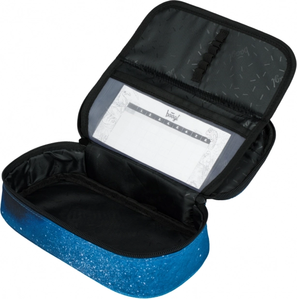 Pevný peračník s výklopnou vnútornou priehradkou obsahujúcou rozvrh hodín a vrecko na zips.