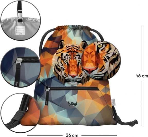 Praktické vrecúško s motívom tigra od značky Baagl, ideálne pre voľnočasové aktivity alebo ako vrecúško na obuv, ponúka jednoduché prenášanie vďaka nastaviteľným šnúrkam a praktickému vrecúšku na zips pre organizáciu predmetov.