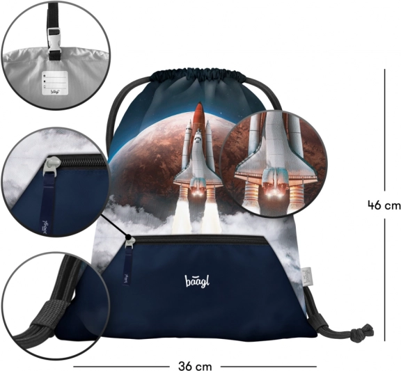Vrecúško BAAGL Space Shuttle dokonale dopĺňa školské vybavenie vďaka karabíne, ktorá umožňuje jeho pripevnenie na aktovku. Je vyrobené z pevného materiálu, ktorý zaručuje dlhú životnosť a jednoduchú údržbu. V spodnej časti vrecúška sa nachádza praktické vrecko na zips na uschovanie drobností.